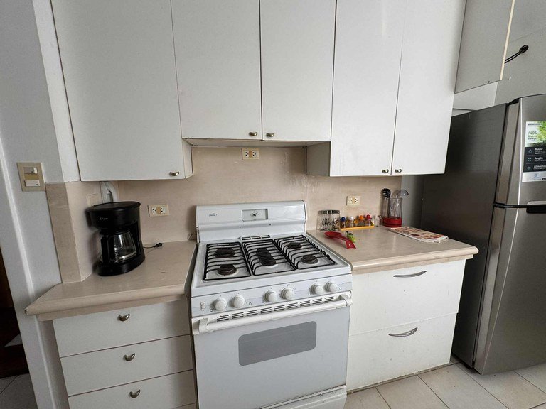 All three bedrooms feature ensuite bathrooms, a rare and highly desirable setup for hosting guests or accommodating family. The primary suite enjoys direct balcony access and ocean views, while additional bedrooms offer flexibility for visitors or workspace needs. A separate service area with laundry and an extra bathroom adds practical convenience.